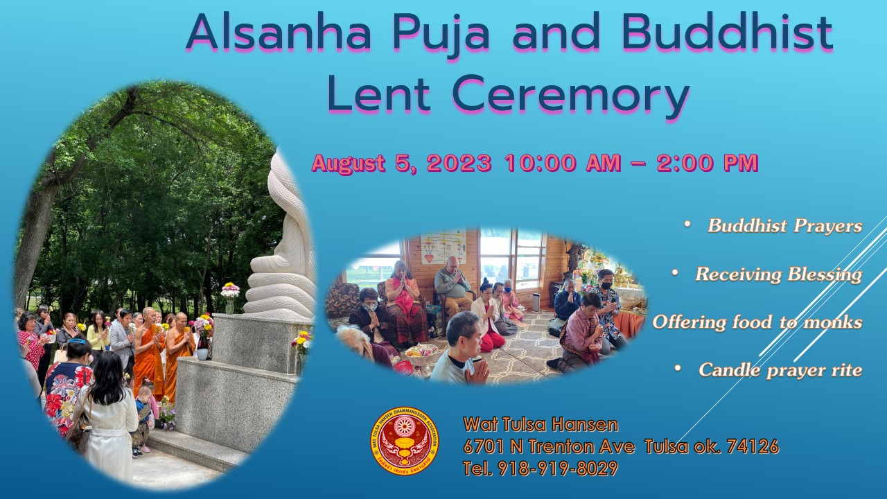 On Saturday, August 5 2023 Tulsa Hansen Dhammanusorn Temple invite you to join our Alsanha Puja and Buddhist Lent Ceremory between 10 AM to 2PM. At the event, there will be Buddhist prayers, receiving blessings and offering food to monks And in the afternoon there will be Candle prayer rite.