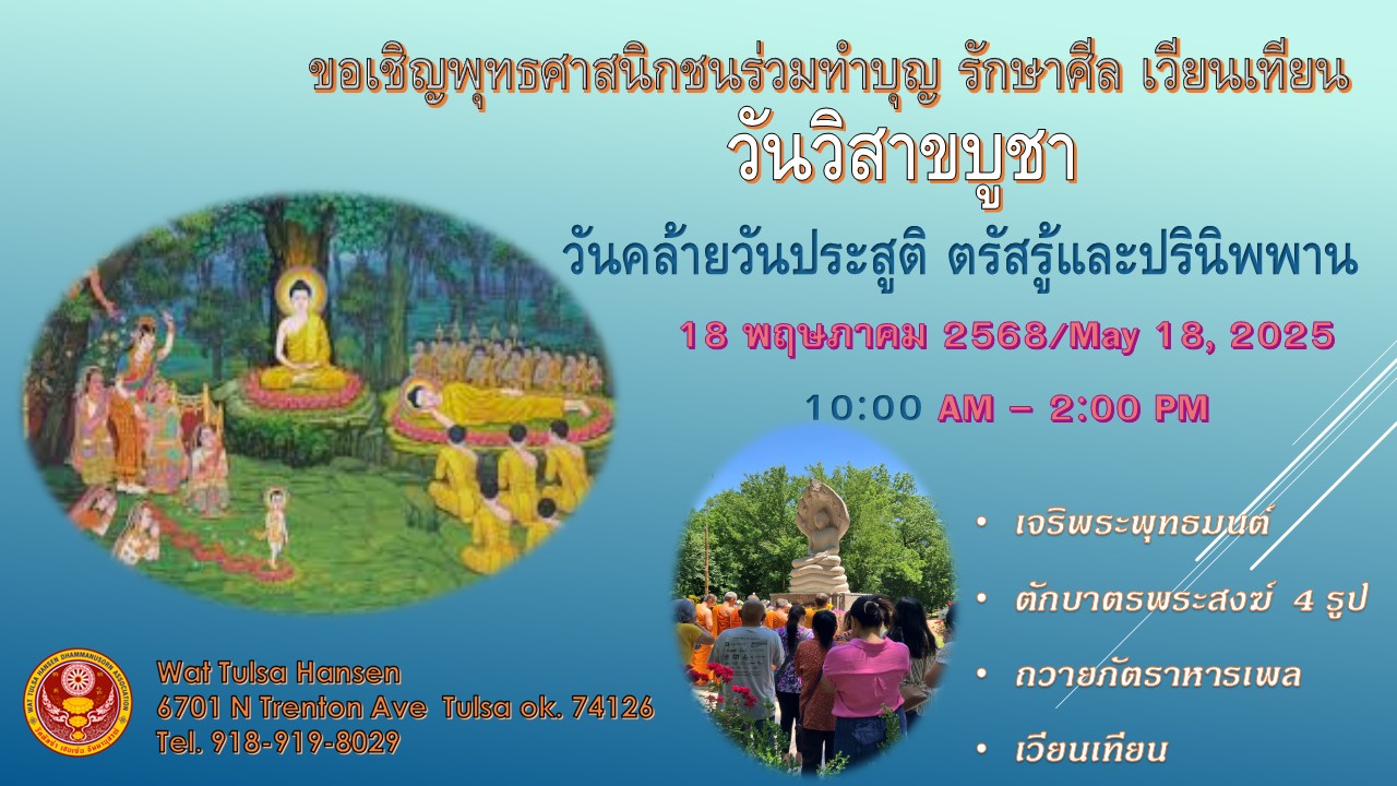 On Sunday, May 18 2025 Tulsa Hansen Dhammanusorn Temple invite you to join our Visakha puja ceremony between 10 AM to 2PM. At the event, there will be Buddhist prayers, receiving blessings and offering food to monks after that in the afternoon there will be Candle prayer rite.